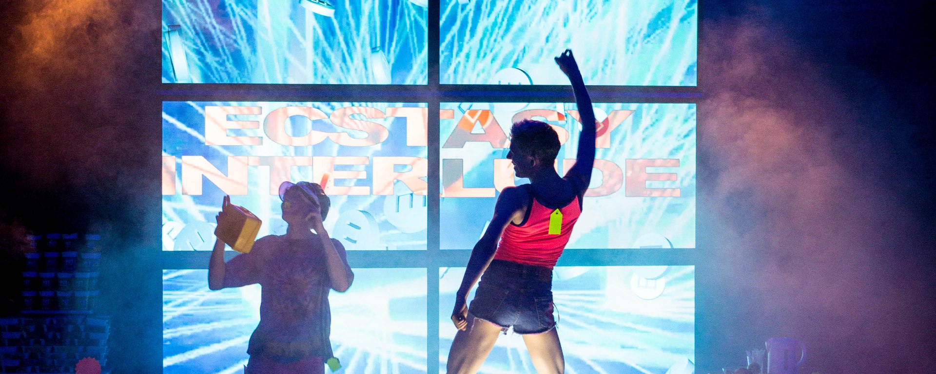 Holmes’ vision for the script is somewhat hit and miss, deciding to deviate from its intimate beginnings into large scale, technicolour camp that borders on the vulgar (not necessarily a bad thing, given the mood of the play). Elements of audience participation have been added to the performance, where viewers are invited to make actual purchases of beer and chocolate during interludes, and at one point even invited onstage to dance with the cast members. Although fun and entertaining to watch, the audience elements and occasional karaoke numbers do more to detract from the focus of the play rather than add to it, ending up becoming spectacle without substance. However, where Holmes does succeed is in the well-used set of screens, live camera feed and greenscreen to create an all new atmosphere emphasising the play’s themes of emptiness and voyeurism, with the camera trained on actors in various scenes to create a sort of augmented reality for the audience, often layering a sense of desolate hopelessness and inescapability on top of the already bleak writing. One particularly good use of the screens was when Robbie and Lulu are doing online camera shows to make money, allowing for audiences to really zoom in on their actions, as if they were truly watching a live internet show (to which Lulu comments ‘Why are there so many sad people in the world?’, while counting out their earnings)