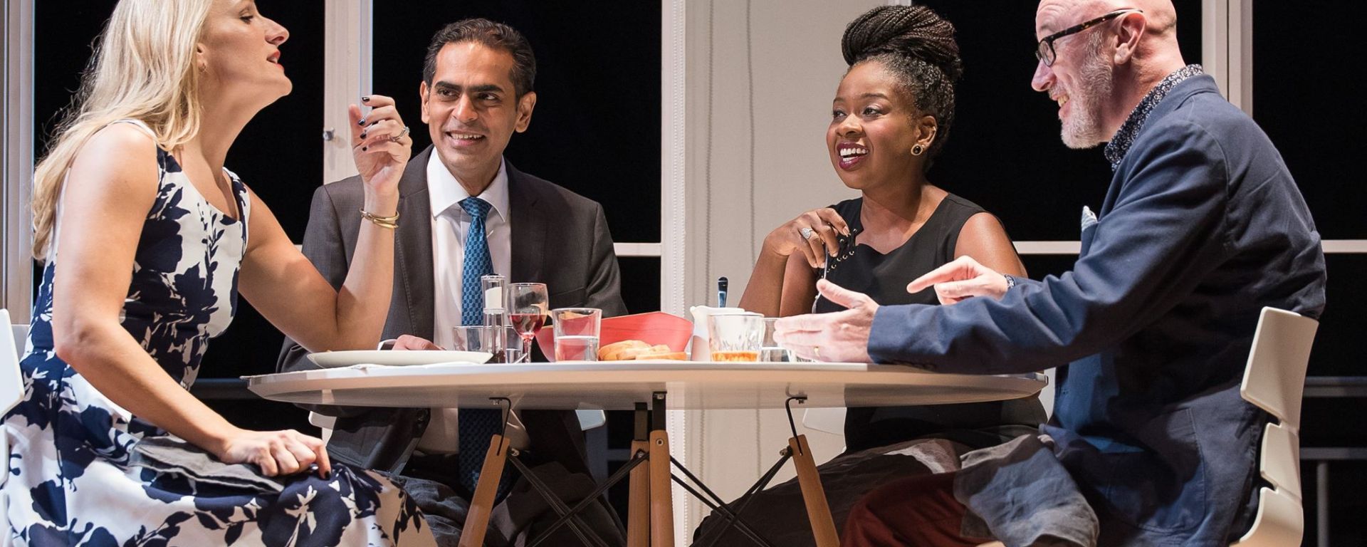 Being the upper middle class Americans they are, the couple hosts a dinner party for Amir’s larger than life colleague Jory (LaNisa Frederick), a strong African-American woman, and her husband Isaac (Daniel Jenkins), with complicated views of his own Jewishness. All seems fine at first, and the two couples laugh and talk about inconsequential jibber-jabber as they munch on salad. But things quickly take a turn for the chaotic when the topic of the authenticity of the Quran is raised, and is even compared to a South Park episode making a jibe at the believability of the Mormon religion (leading to a few nervous laughs from the audience).