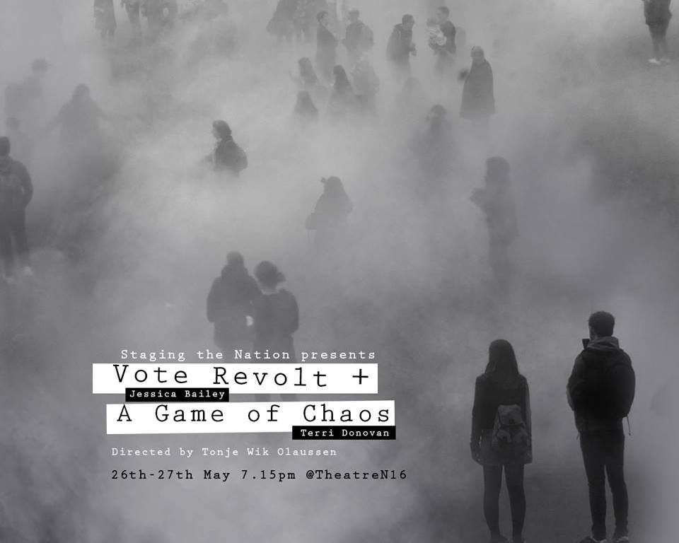 Vote Revolt+A Game of Chaos plyas at Theatre N16 (77 Bedford Hill, London SW12 9HD) on 26 and 27 May. Tickets available here