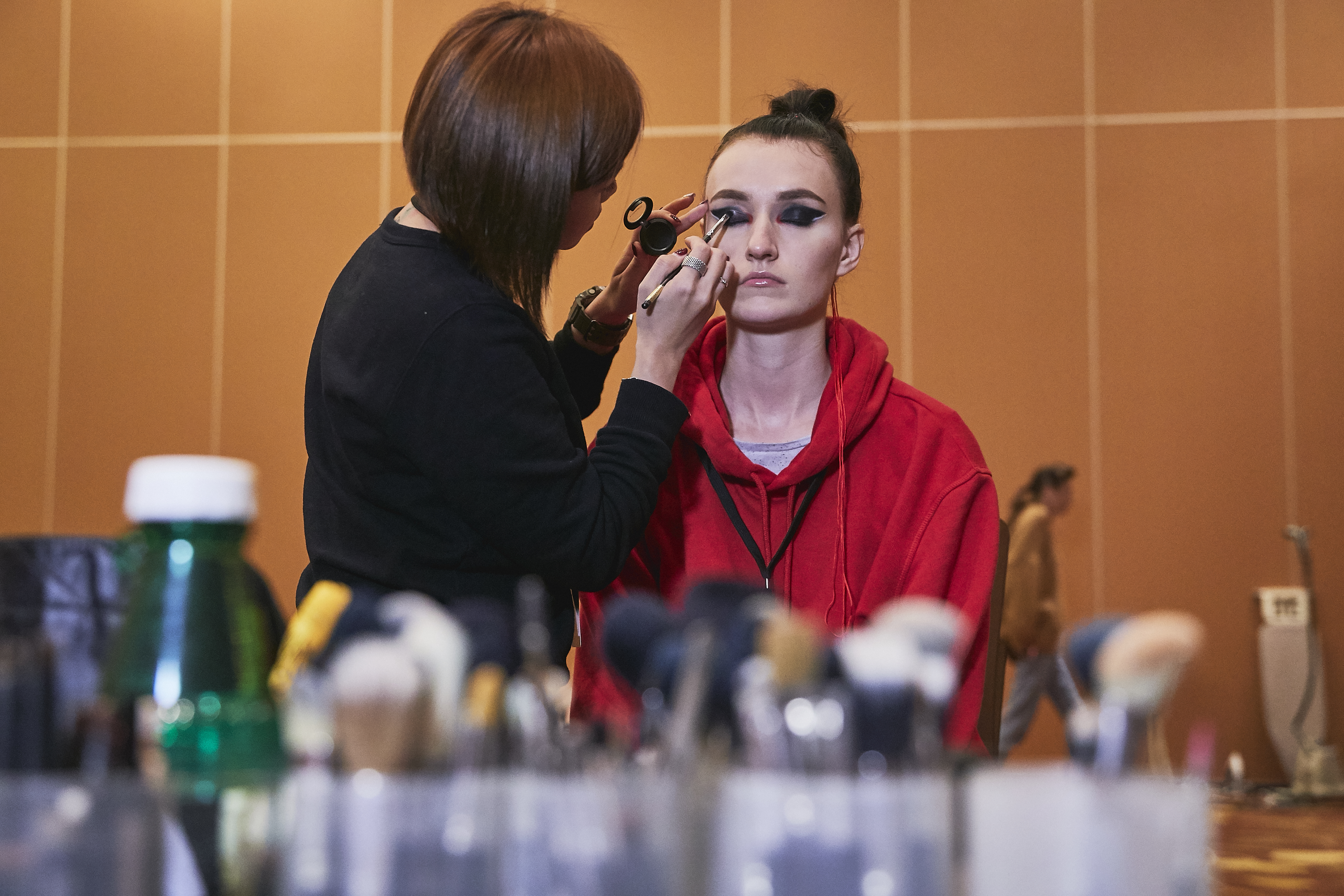 A model getting her final touches before taking the stage at the WTA Finals Gala Dinner