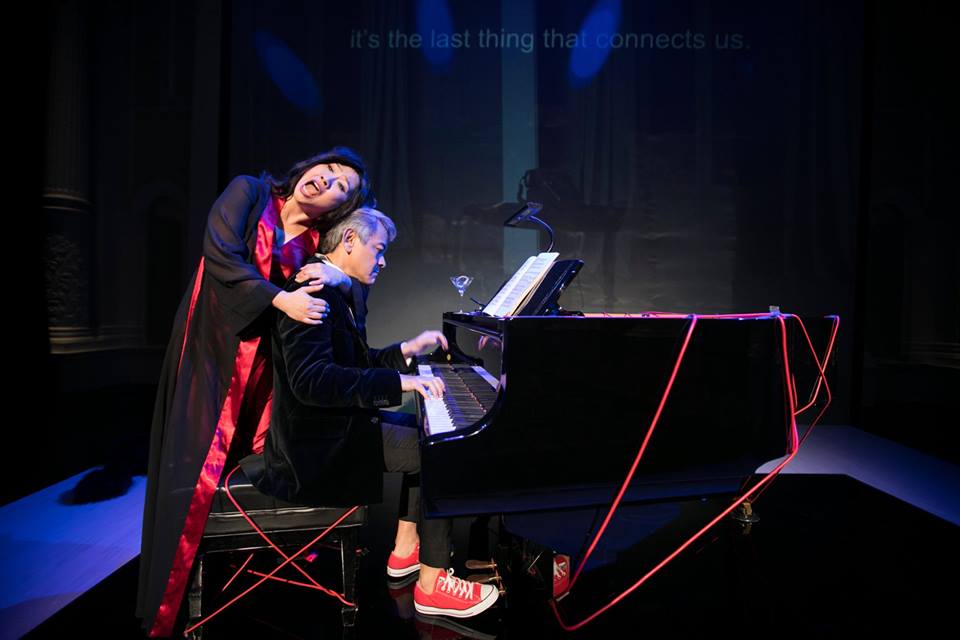Providing both music and acting as the visual representation of her unnamed lover, pianist Shane Thio is seated front and centre of the stage with a piano ominously tangled up in red phone cord, and handles Poulenc’s erratic score with aplomb and bringing out the score’s almost human-like movements and tones. The red phone cord is a particularly outstanding design choice, standing out against the ebony piano, and well representing the complicated, passionate relationship and bold, fiery feelings that go into Elle’s conversation, as she speaks of blood, death and overwhelming emotion. Shane In addition, Shane is not simply a complement for Jennifer Lien’s performance, but an active presence she speaks to and interacts with, a call and response to her voice. Both share a strong onstage chemistry that elevates the opera from a simple monodrama to a moving, all too familiar scene of the last strings of a relationship snapping in real time. There is a palpable tension in the air as Jennifer balances singing to Shane, who ignores her advances, and forcefully roaming the stage, popping pills and raging to the audience.