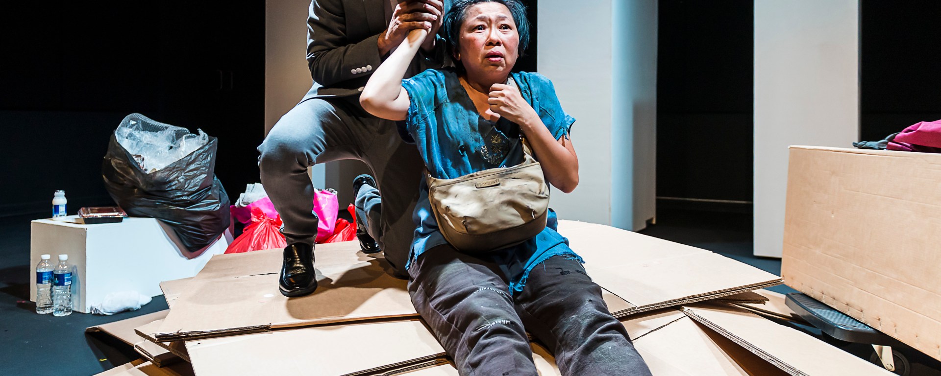 With a capable ensemble of actors, each one fully committing to their roles and bringing out every nuance required of their character (Siti Khalijah does especially well to move us with a controlled but affecting performance as a grieving mother), it is Goh Guat Kian’s performance that most of the play hinges on in playing her role sympathetically, yet never pitifully. There is a quiet strength to Guat Kian’s performance that makes her a force to reckon with; even with slurred speech, she remains a stubborn optimist and survivor at heart. It is this performance that ultimately leaves us with the internal, pained struggle as we watch Xinyi’s life enter a downward spiral. There are times she faces immense difficulty in tearing down the cardboard boxes around her, piling them onto a pushcart. As she struggles, we feel for her, yet are still left in a dilemma if we should get up and help or not, and once again reminds us of the beginning, as we are left with this similar inconvenient choice.