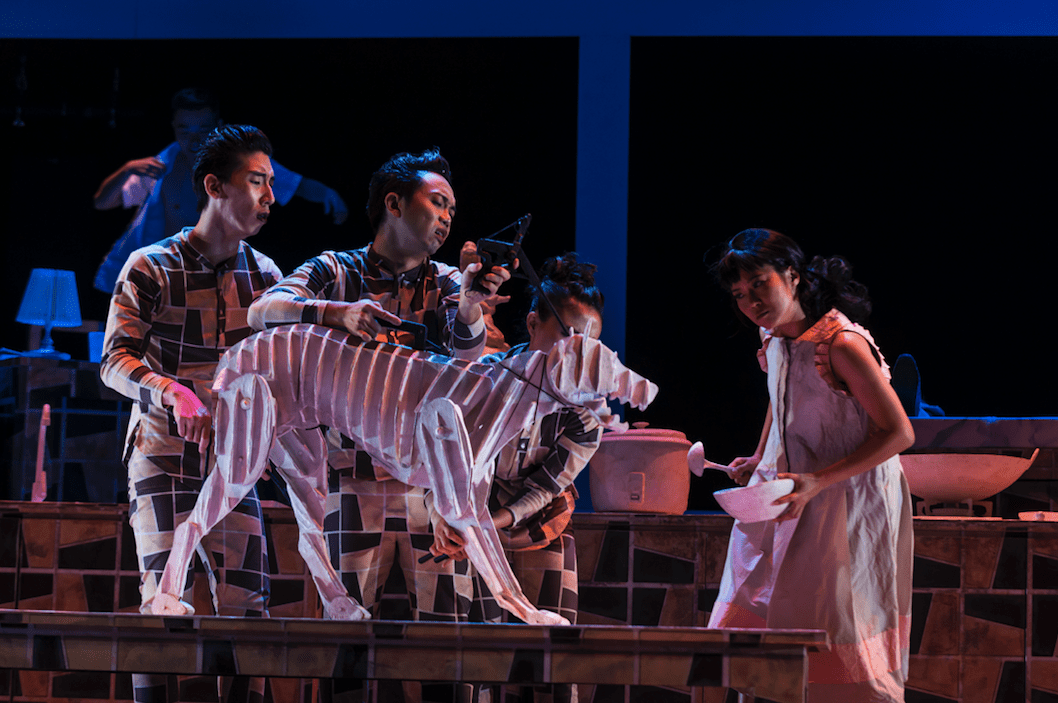 Above all, it is the white dog puppet co-designed by Oliver Chong and Jack Chen of tsai design that steals the show in every scene it appears in. Controlled by a three-man team comprising Darren Guo, Ann Lek and Trey Ho, there is so much effort that goes into puppeteering this creature, from the way it leaps from floor to table, to the way the dog speaks, unabashedly foul-mouthed as it barks criticism and howls in hunger (encapsulated by its skinny, skeletal body). The puppeteers sync their voices and movements perfectly, realistically echoing the way an actual dog walks and behaves, catching every detail right down to the wagging of its tail, and this sassy but fiercely loyal creature is often a welcome source of comedy amidst the darker elements of the play. Yet despite its devotion, its barks fall on deaf ears, and one feels sympathy for this animal trying its best to protect its owners in any way possible, yet powerless to do anything about it (a helplessness we ourselves experience in much of daily life).