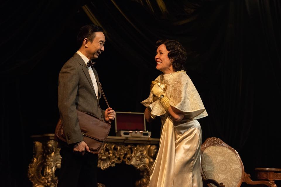 The winning combination of set designer Wong Chee Wai and lighting designer Petrina Dawn Tan does wonders to set the mood and immerse audiences in the play. Besides having decorated the KC Arts Centre’s lights with crystal and even a chandelier, the stage is given the illusion of depth with multiple layers of velvet curtains making it look far bigger than it actually is, while framing the two actors such that they are never engulfed by the set and lit to always be the centre of attention. Costume designer Rey Lee’s multiple outfits for Florence are also delightfully done, with each colourful, over the top getup seen in the final medley of songs outdoing the last.