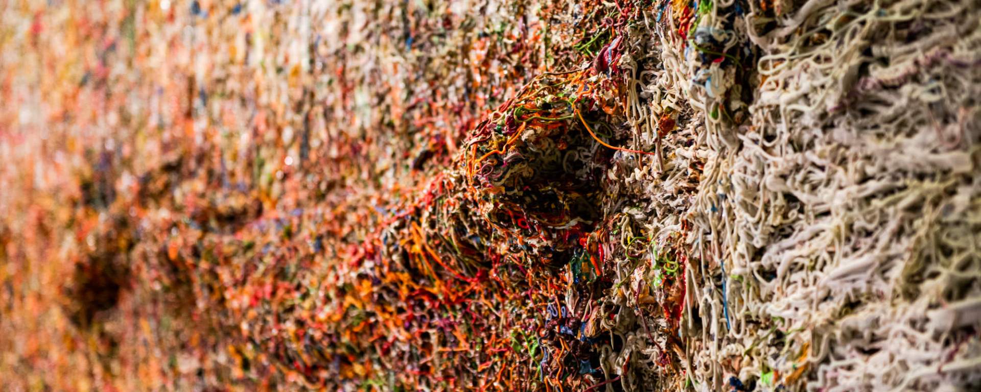 Raw Canvas was first displayed at the 2008 Singapore Biennale, in this same location at the City Hall historical staircase. Ten years later, it has been returned. The work blurs the perceptual boundaries between fabric and paint. It comprises 40 square panels of densely-applied crisscrossing strands of silicone-incorporated acrylic and enamel paint, creating the appearance of a piece of textile draped over the wall. In the surrounding mirror-tiled wall, they can also look upon a shimmering but fragmented reflection of Raw Canvas and themselves. At the same time, the work refracts and re-articulates our relationship with this art historical moment.