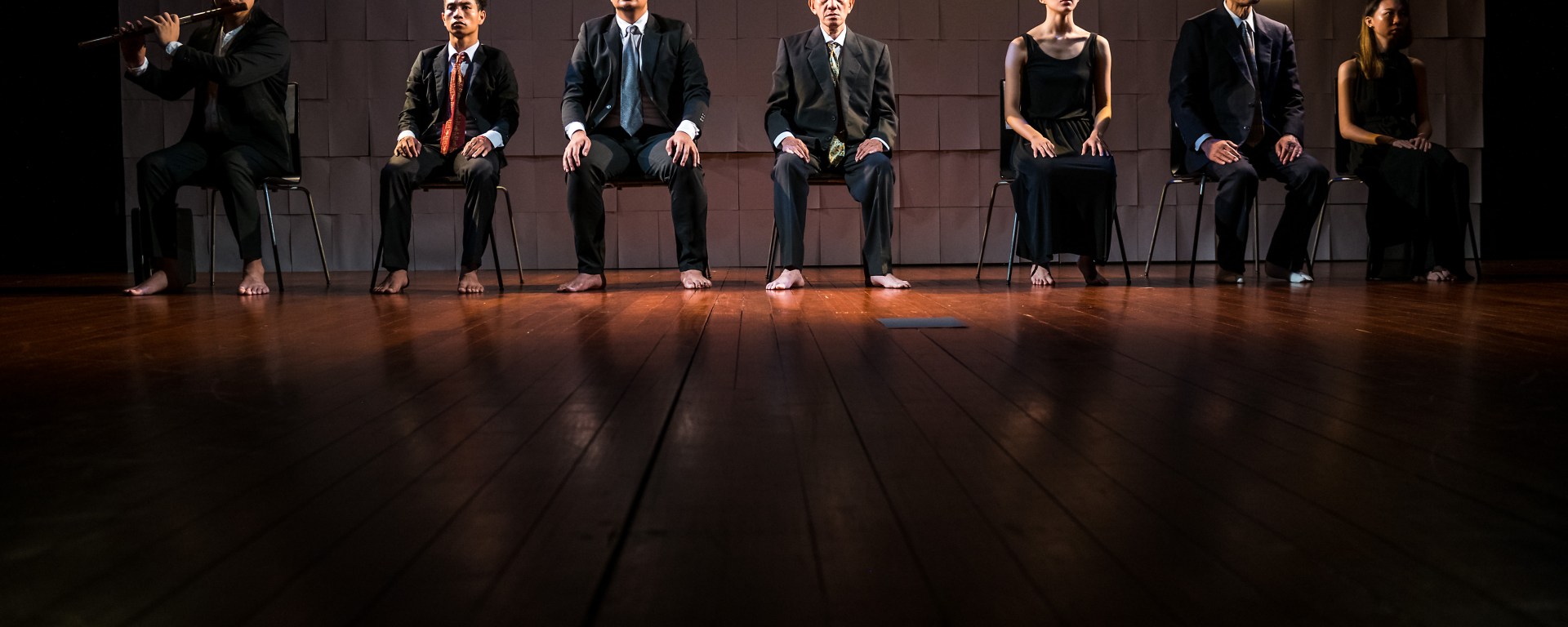 Equally powerful is towards the production’s finale, where all seven artists are in a row, performing their own art form, before Nget breaks away, suddenly transformed into a mad dog as he dashes across chairs on all fours, yelping and slamming himself again the locked doors as he fails to escape. One wonders then about the restrictions and rules certain institutions or expectations might have placed upon artists, such that they feel constrained in their creative process, unable to find alternative paths to success and trapped in a no man’s land of prescriptive, not organic art.