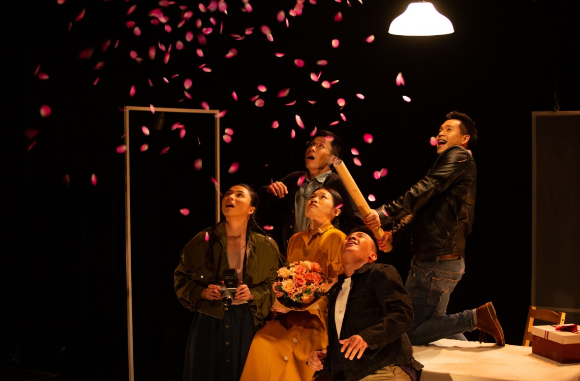 Dear Elena takes place over the course of a single night, towards the end of the Soviet Union as four students spring a birthday surprise on arrive at their beloved teacher. Nelson Chia’s sparse set comprising chairs, tables and frames for doors and windows leaves much to the imagination, with even a bed and toilet represented by chalk drawings on the floor, allowing the acting and script to become our focus instead. As the students enter Elena’s home, the mood is joyous, with a youthful energy that fills the space as they rush in with gifts, flowers and wide grins. A sudden bang is heard as a confetti popper is fired off like a gunshot, leaving pink, petal-like confetti strewn all over the floor, where it will stay for the remainder of the play, as if trees have shed their flowers, symbolic of youthful years now fallen.