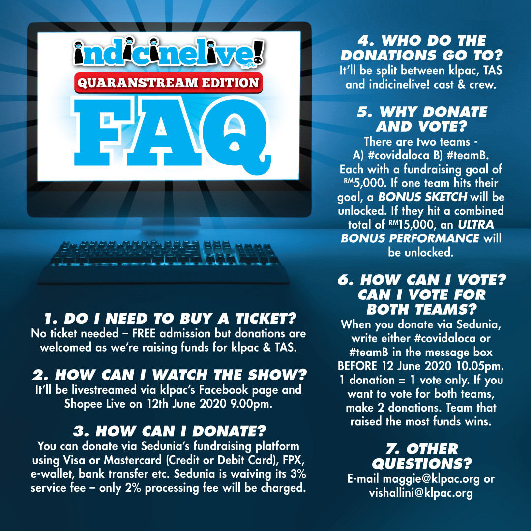 indicinelive! was streamed online on 12th June 2020, 9pm on Facebook and Shopee Live. The performance was free, however, you can continue contributing to their fundraiser helping klpac and The Actors Studios here
