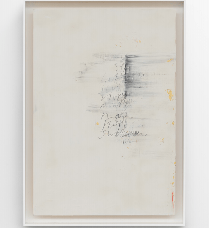 Edmund de Waal, Wu-chüeh: two poems, 2020, kaolin, gold leaf, graphite, compressed charcoal, and oil stick on ash, in aluminum frame, 36 1/4 × 26 × 3 inches (92 × 66 × 7.5 cm) © Edmund de Waal