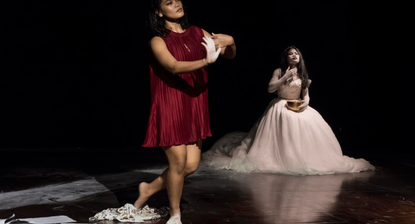 With ominous, foreboding music, Ny Lai gets up again, zombie-like as she seems to exert effort even from trudging across the stage before collapsing into a heap on the ground. Sreynoch, ever the best friend, goes over in an attempt to ‘revive’ her, jumping over her still body, desperately lifting her wrist to check for a pulse, animal-like in her fidgety, nervous persona.