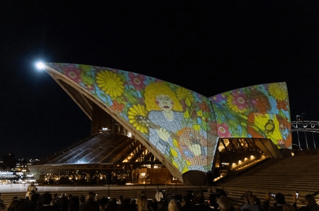 six female Aboriginal artists projected onto the sails of Sydney Opera House.