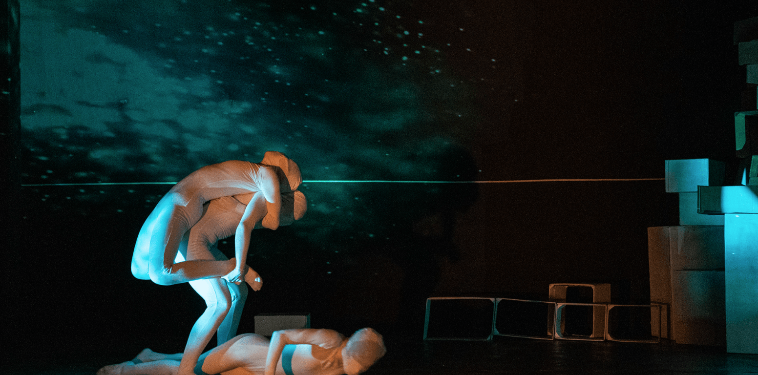 Even as the cacophonous music begins to get louder, and repeats over and over, the dancers remain undeterred and press on. Eventually, the music goes quiet, and it seems the storm is finally over. Tentatively, one dancer begins to reassemble the structure that was knocked down, and starts the process of restoring what was lost in the chaos. Images of the universe are projected onto the dancers’ white suits, reminding us how they all belong to the same world, connected to each other even if they appear different. One dancer pushes a large structure to the middle of the stage, and it seems the dancers are learning to work together to survive as one, growing together and rebuilding their fallen city to venture forth into the great unknown as one species, unafraid of any obstacles.