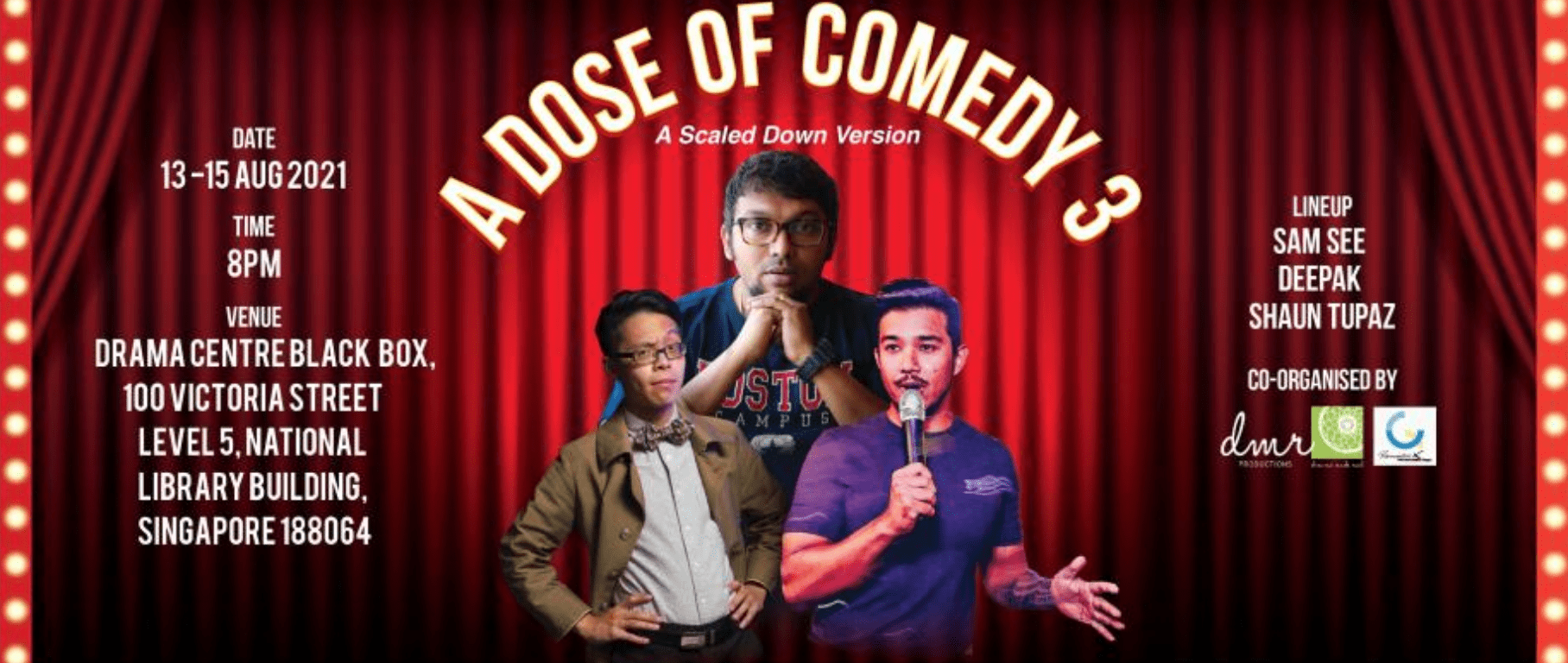 A Dose of Comedy 3 runs from 13th to 15th August 2021 at the Drama Centre Black Box. Tickets available from Peatix