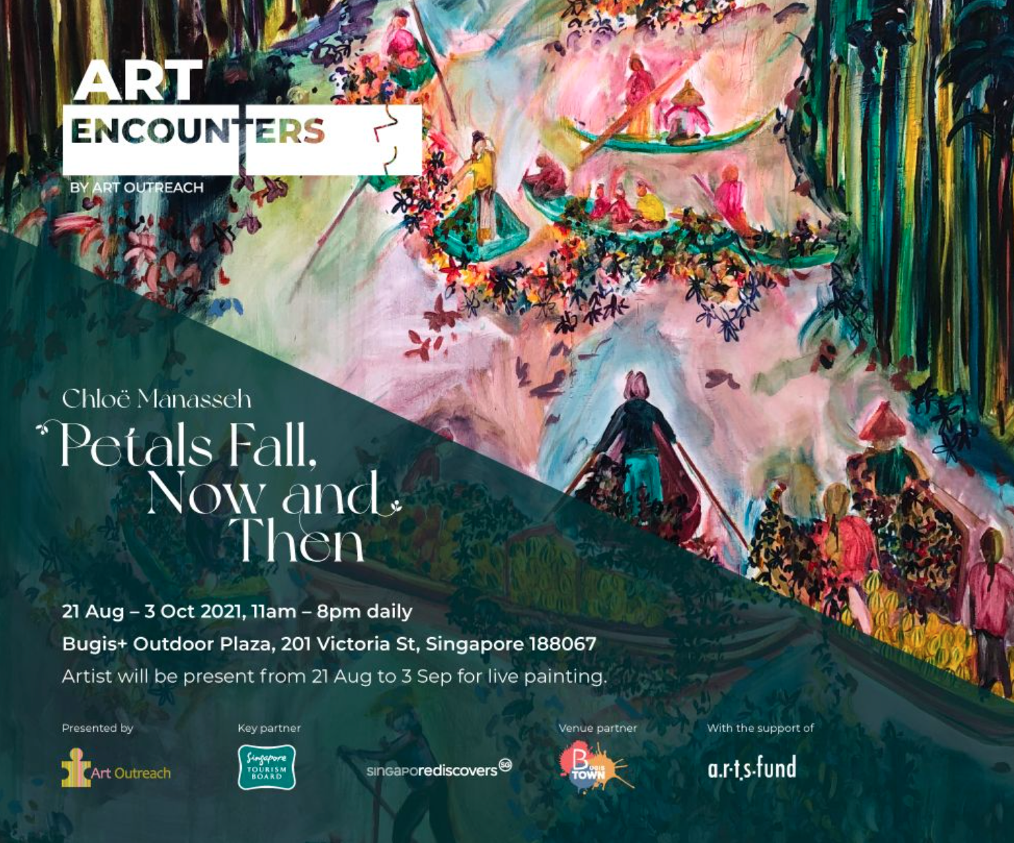 Petals Fall, Now and Then by Chloë Manasseh will open daily from 21st August to 3rd October 2021, 11am to 8pm, at the outdoor plaza of Bugis+. Artwork wraps featuring Manasseh’s works will be peppered throughout Bugis Town throughout this period. The artist will be live painting within the space from 21st August to 3rd September 2021, and sharing more about her practice and process developing the installation on Instagram live in September. Details to be announced on Art Outreach and Bugis Town’s socials. More information available here