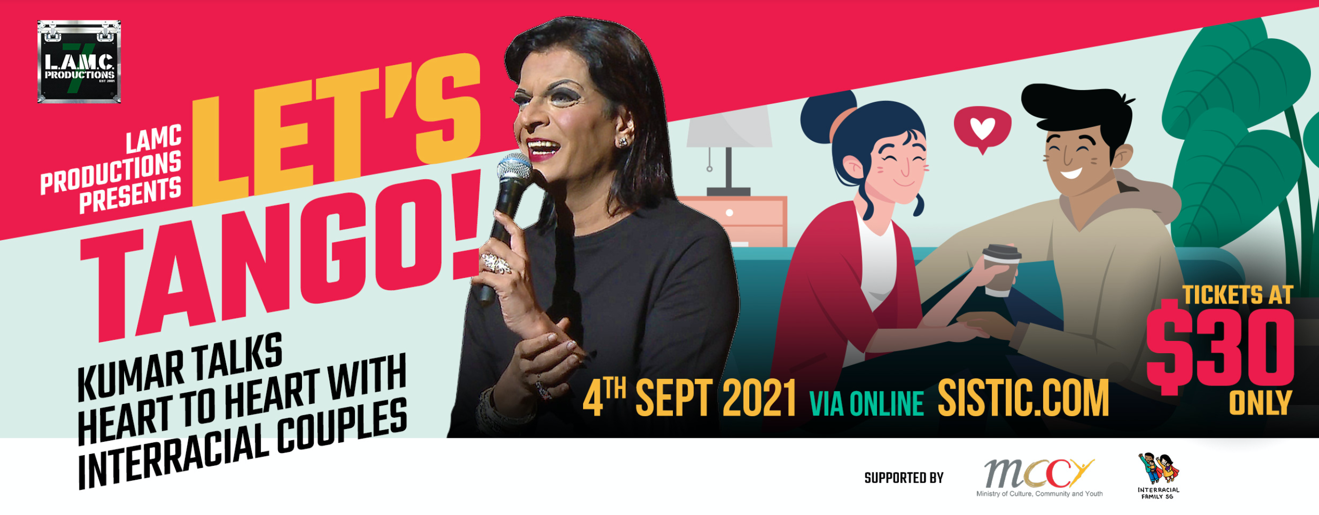 With that in mind, LAMC Productions presents Lets Tango! Kumar Talks Heart to Heart with Interracial Couples, a one-hour ticketed talk show to be streamed via Sistic Live, featuring Singapore’s (drag) queen of comedy Kumar and a panel of interracial couples in Singapore.
