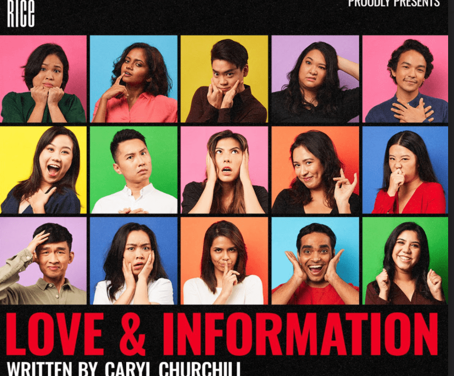 Originally performed at London’s Royal Court Theatre in 2012, Love & Information is unique in that it comprises multiple short scenes, each lasting a few minutes long at most, making up seven sections in total. The director however, has the freedom to rearrange the scenes within each section, changing up each section’s story and themes according to the production, which offers very few specific stage directions. Plus, with over 100 characters whose genders are not set in stone, the possibilities are endless for casts of varying sizes.