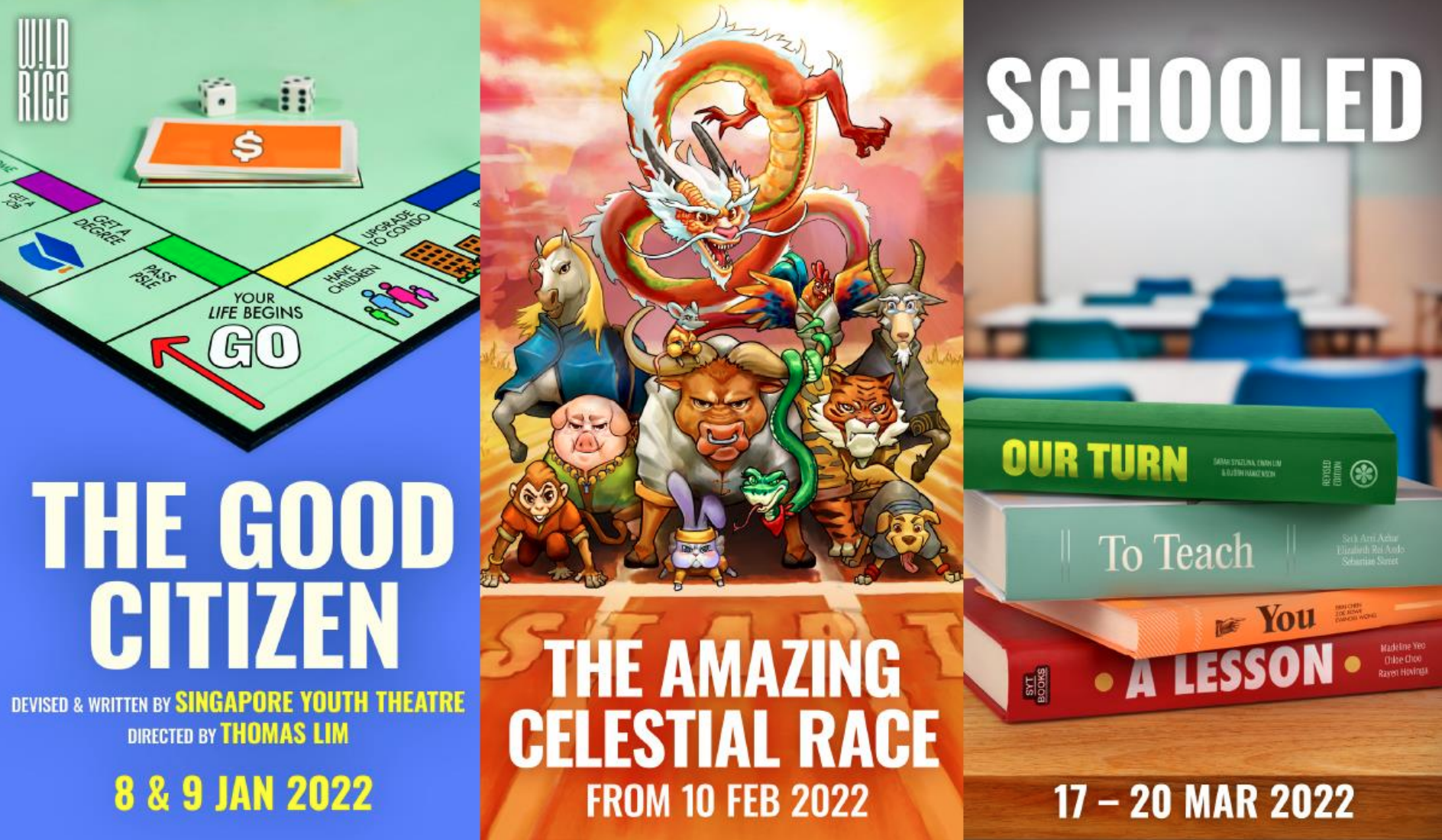 Ushering in a better year in theatre, Wild Rice has announced the first three shows of 2022 – The Good Citizen (8th to 9th January 2022), The Amazing Celestial Race (from 10th February 2022), and Schooled (17th to 20th March 2022) all playing at the Ngee Ann Kongsi Theatre in Funan.