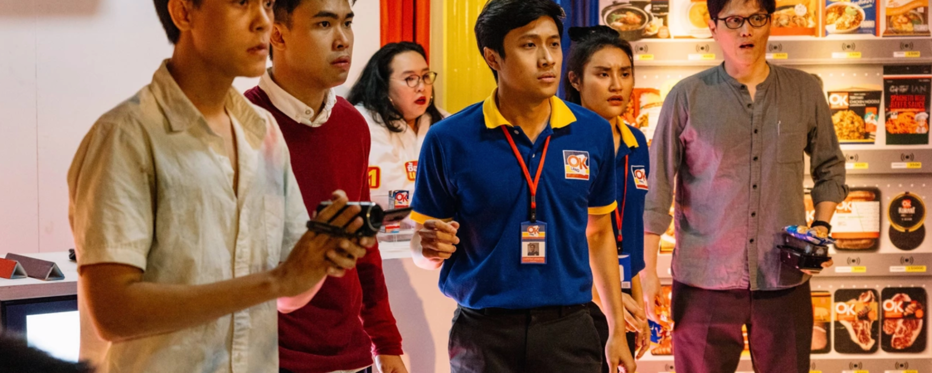 Staged at Bangkok’s 6060 Arts Space, much work has gone into uncanny realism of art director Monsuntorn Surach’s set design, where the audience members are seated within the ‘convenience store’ itself, complete with a counter, shelves lined with countless products clearly labelled with OK Land’s logo, and a glass door that announces a cheery ‘Ok!” every time a customer enters or exits. OK Land manager Boss (Chanut Pongpanich) and employee Joy (Skaow Karnkornkamol) are dressed in identical blue and yellow polo tees, OK Land’s uniform, and amidst a pandemic taking place across the country, just want to get by. Performing the OK Land jingle (set to the chicken dance song) at the start of each day, their lives are the same day in, day out, as they wonder if there’s any better alternative. Meanwhile, they ignore the resident ghost (Bhumibhat Thavornsiri) haunting the store, film camera in hand as he darts about.