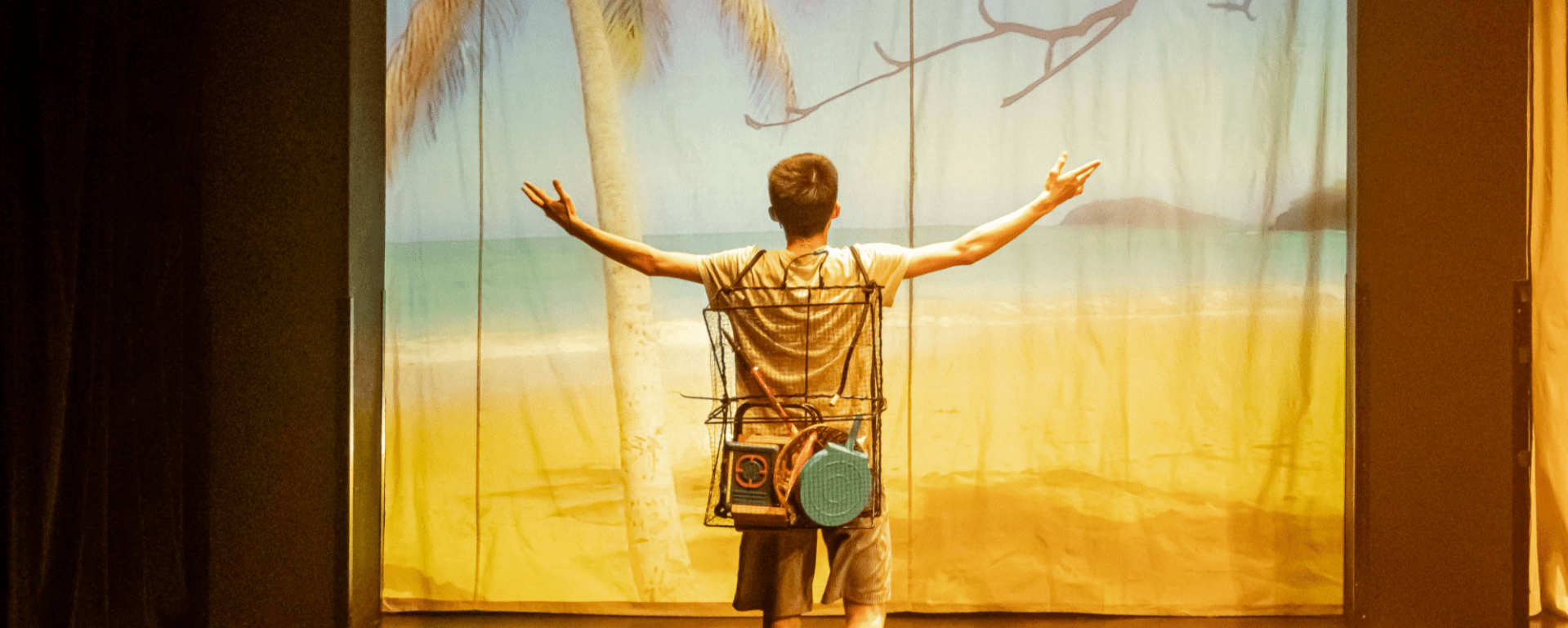 Coming back to the performance itself, Hai Bin brings a sense of child-like enthusiasm and wonder when X finally takes the leap of faith to enter the ocean, particularly as he uses paraphernalia like a pump or long socks to act as his oxygen tank and flippers respectively, encouraging us to use our imagination to see the possibilities that exist in the everyday. We feel the joy and the lightness of his body as he speedily slices up (plastic) fish to cook, or the way he casts a ‘fishing rod’ out to sea, all while donning a cardboard crown, and his attitude and movements make us feel equally relaxed, curious to see where his adventures will lead him.