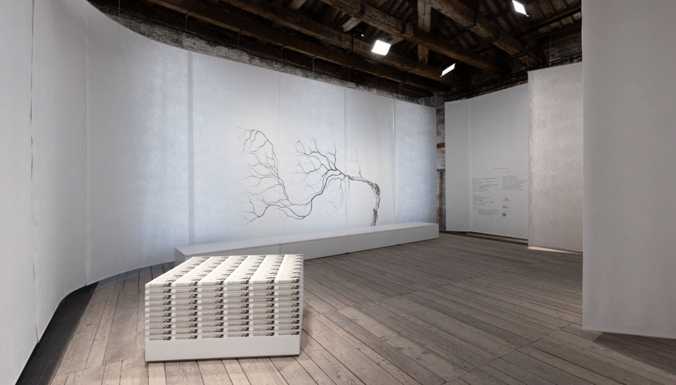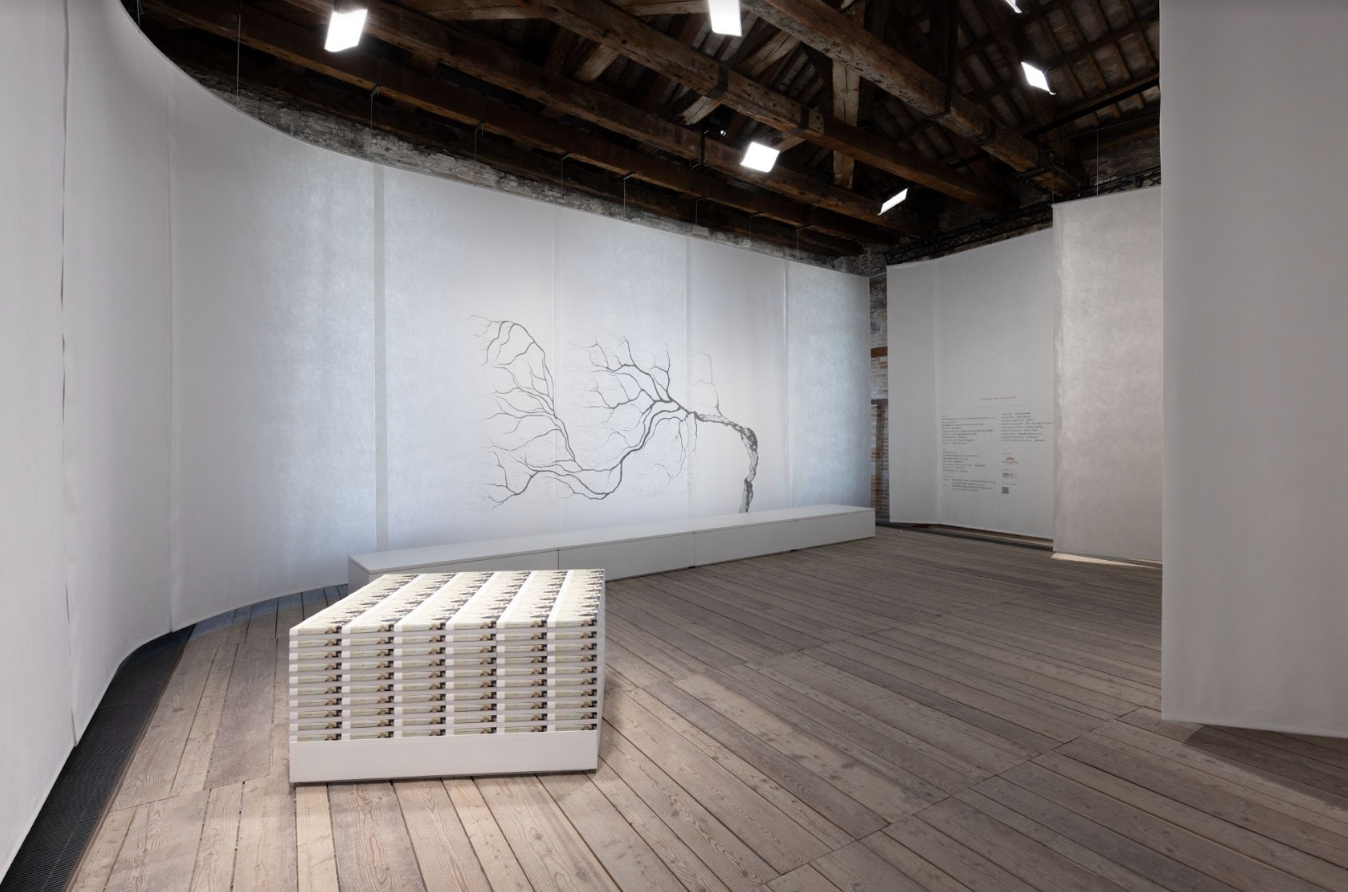 Copies of Rao’s new book, Pulp III: An Intimate Inventory of the Banished Book (Pulp Vol. III), are arranged in a way that speaks of the monumentality of its format as a container of knowledge. Pulp Vol. III chronicles Rao’s long-term artistic research process and conceptual reframing of the book and the library, whilst adding new research on Singapore and Venice as historic centres of print. Over the course of the Biennale Arte 2022, this installation of books will change in form as they are dispersed into the world. For Rao, each book is a messenger, a time-traveller, the embodiment of our need to communicate, and a rallying call to action.