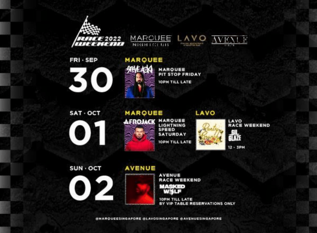 Admission to AVENUE Race Weekend with Masked Wolf is strictly by table reservations only. For enquiries or reservations, guests can e-mail avenue.reservations@marinabaysands.com or call +65 6688 8680. For more updates, follow AVENUE’s Instagram account (@avenuesingapore) or visit the website.