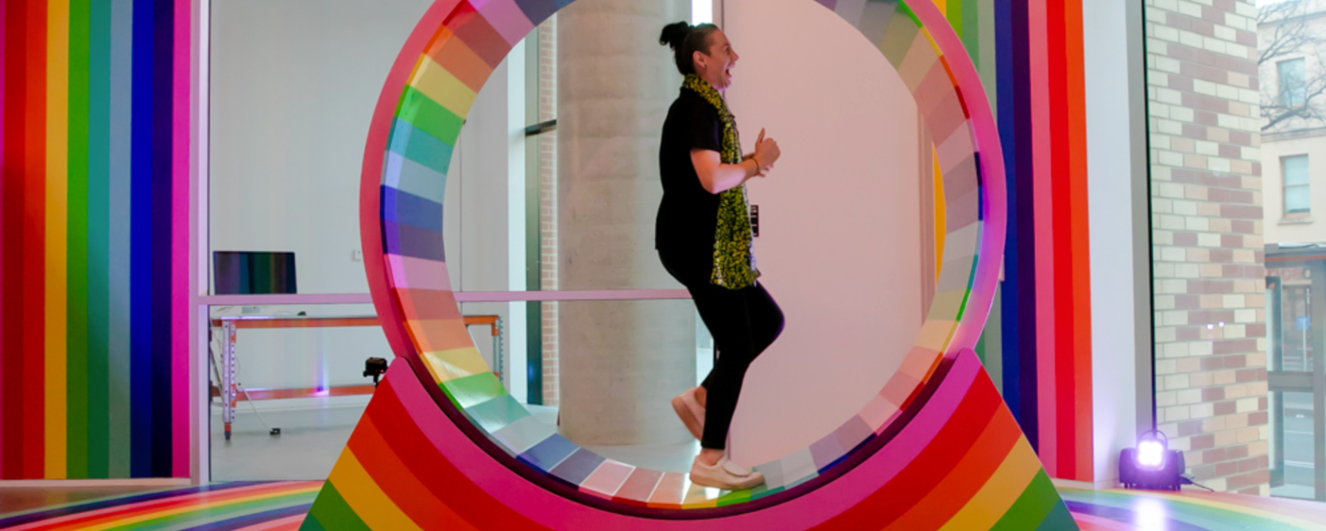 Many of the installations in MENTAL: Colours of Wellbeing encourage interaction, allowing visitors to become part of the works themselves. Key examples include an enormous rainbow-shaped ‘hamster’ wheel titled Wheel (2021), a collaboration between renowned artist Hiromi Tango and researcher, Dr Emma Burrows from the Florey Institute of Neuroscience and Mental Health. This work examines how colour, playful spaces and exercise can influence mood, as well as how social rewards affect one’s commitment to exercise. A giant, brightly coloured wheel and wheelchair-accessible exercise machine are connected to a collective trip odometer that counts the distance clocked by visitors over the exhibition run. Viewers can also join the action online by watching a livestream of participants’ hands or feet and cheering them on from the sidelines through a ‘like’ button. Ultimately, the installation explores the commitment to staying motivated through this ‘mood medicine’.