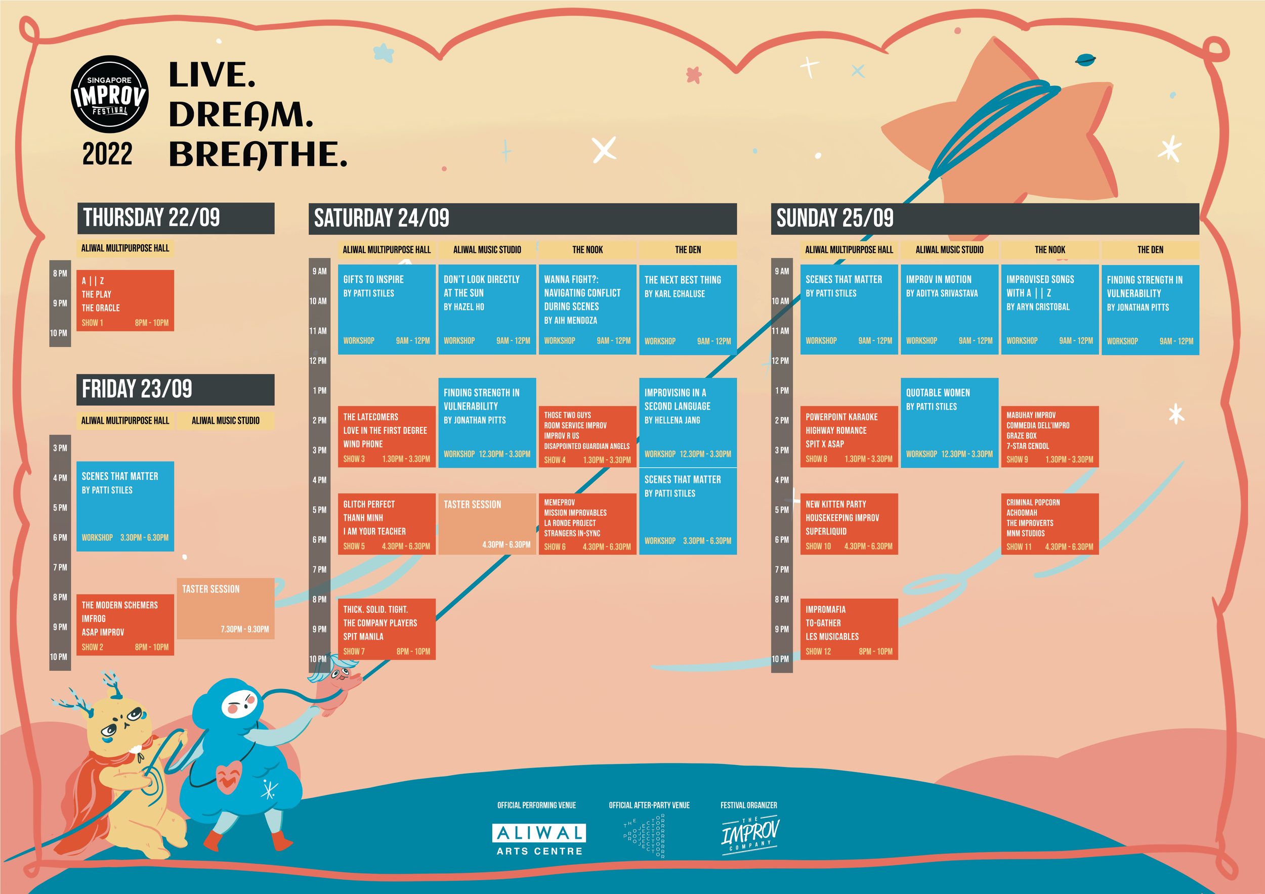 Explaining this year’s theme for SIF, Kim Tan, Co-founder and Creative Director of The Improv Company said, “Going back to live theater after the pandemic was one of the great joys for people around the world. ‘Dream Live Breathe’ is about the resilience and anticipation of this joy that kept us going and brought us together. We look forward to gathering Improvisers from around the world on the Singapore stage once again and showcase the best of Singapore’s alternative theater and art scene.”