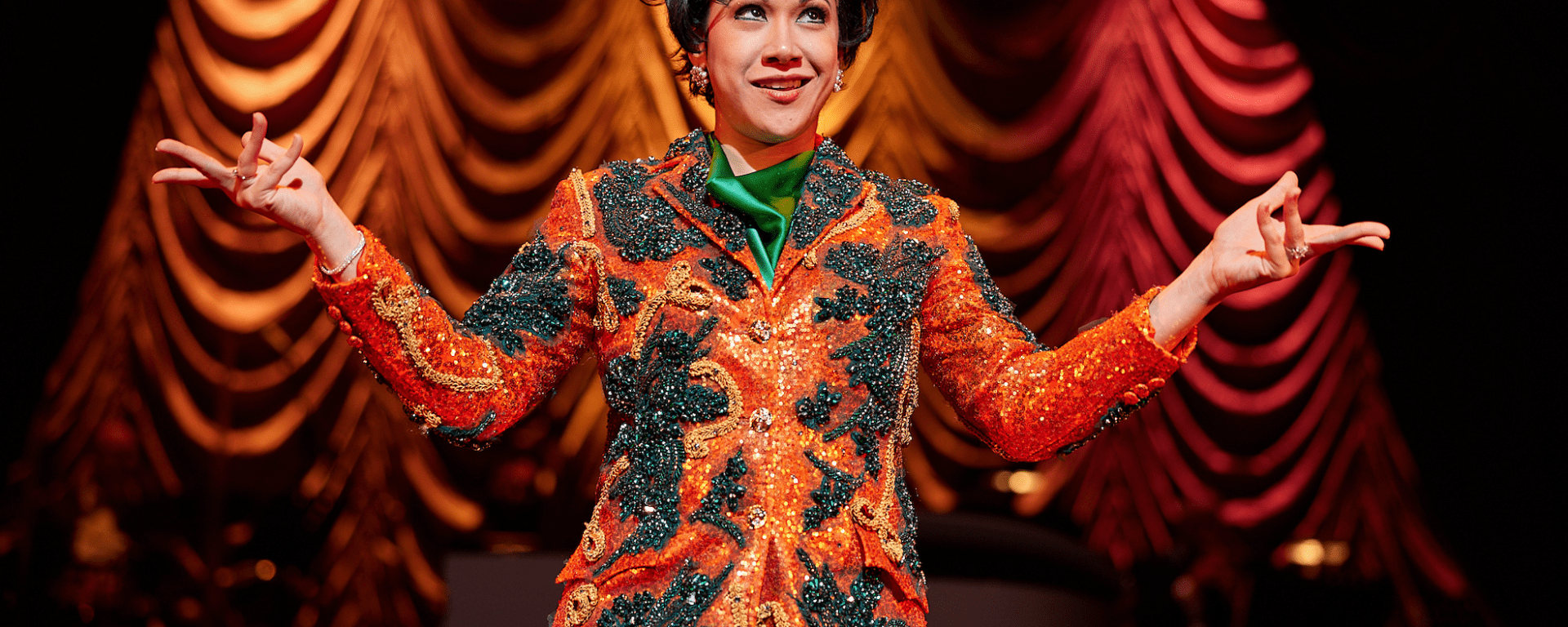 Mina’s true star quality fully emerges when she takes to the stage as a singer, and embodies Judy Garland in all her glory. From the endearing performance of ‘The Trolley Song’ to the high-energy, showstopping ‘Come Rain or Come Shine’ to the point of exhaustion and collapse, there is an ease and confidence to Mina’s singing that speaks of a seasoned performer, while still capturing Judy’s signature style and movements onstage. There is genuine emotion and power each time she opens her mouth to sing, every note and lyric clear when necessary, and naturally, helped by Leonard Augustine Choo’s costumes. Taking inspiration from Judy Garland herself, Leonard has outdone himself when it comes to dressing Mina for the role, from a luxurious orange silk suit based on a real outfit Judy wore, to even matching the exact bold, floral-print dress worn by Renee Zellweger in the film adaptation. Donning these, Mina practically becomes Judy as she commands the stage, the audience unable to look away, fixated on the sheer talent and star-quality Mina exudes as Judy.