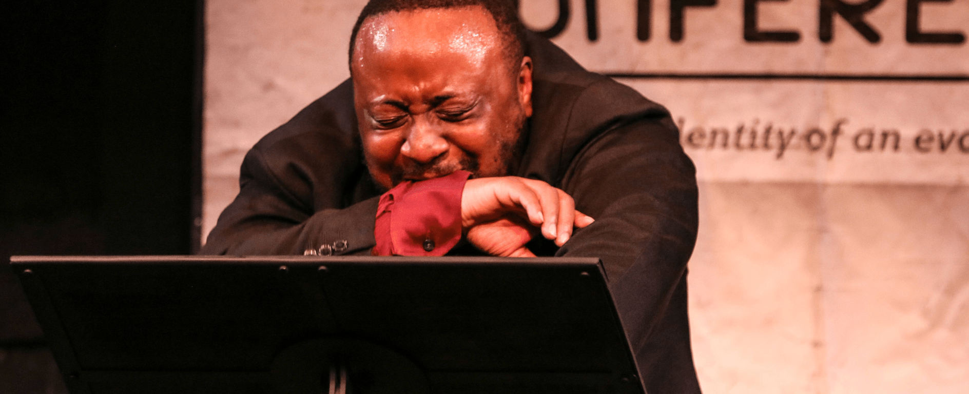 A faint echo of a line repeats over the speakers: ‘My skin is not necessarily my truth’, before performer Tony Bonani Miyambo comes onstage. He is well dressed, a red shirt with a black jacket and matching pants, wielding a cane to aid his limping gait. The one thing that is immediately off is his lack of shoes, revealing his naked feet and toes. Tony is Red Peter, an ape who has learnt human speech, and he is about to tell us his story, a tale of struggle and pain.