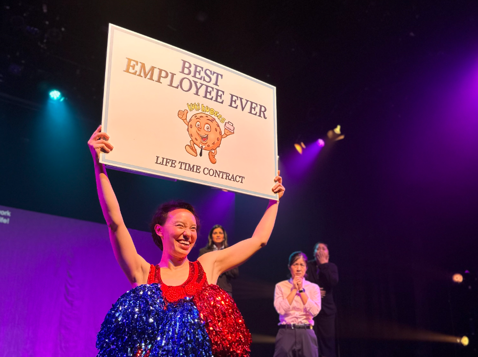 As for the gameshow itself, Deonn has fun satirising the office grind, with ‘extreme’ games involving calculation using Excel formulas, or even typing a letter of termination to a colleague. These could however, be taken further, and lack any real stakes when Min debates between doing what is necessary to win, or being true to herself, with the portrayal of each game needing more drama. As much as the actors try their best to sell the illusion, rather than typing away at invisible laptops, one feels that more could have been done to heighten the tension, whether utilising the screen behind, sound effects, or even actually having physical laptops in front of them.