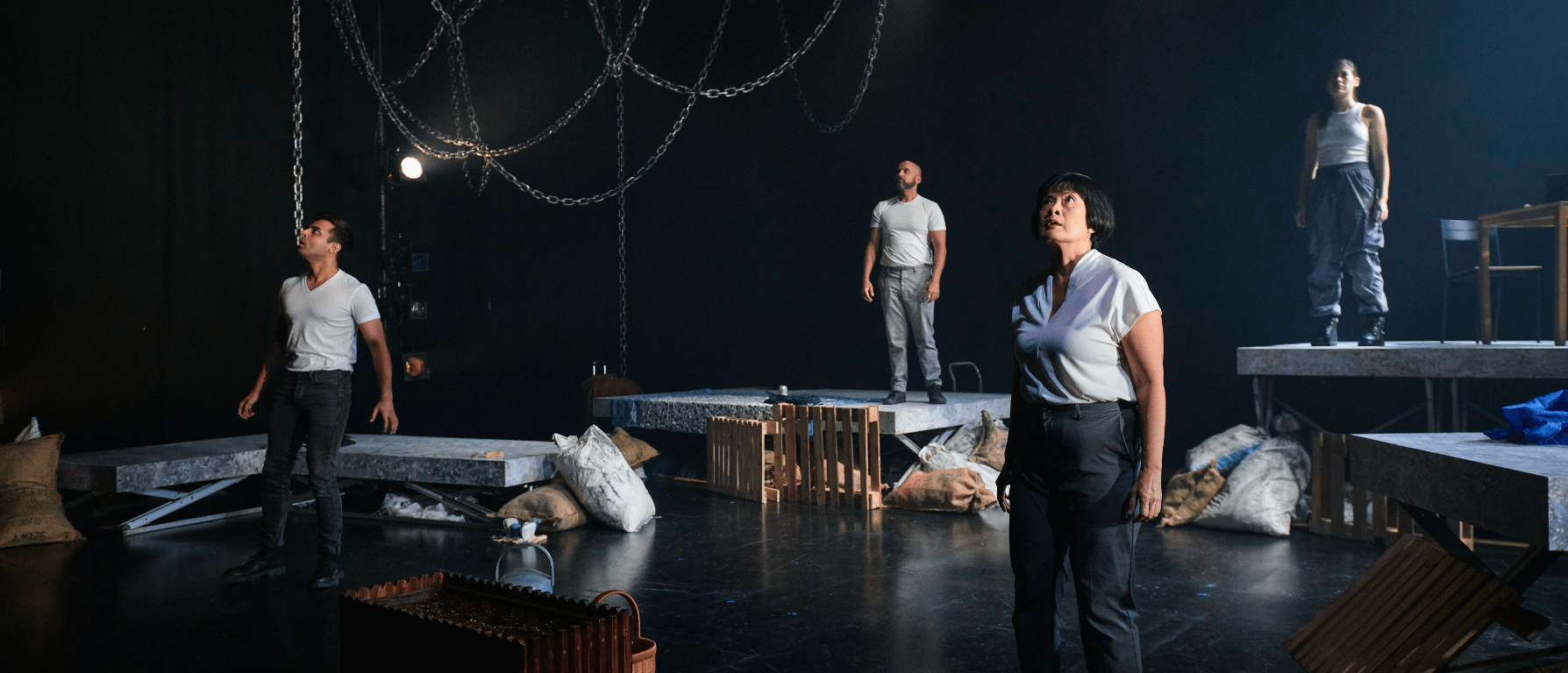 Chaos is at the heart of No Particular Order, and that is evident even in the design elements. Hella Chan’s set sees chains strung from the ceiling, while sandbags, concrete-grey slabs and wooden furniture are arranged around the stage, forming areas for various scenes to take place. It’s a set that feels messy, and while it does line up with the central theme of strife and disorder, hinders the actors, with long blackouts to facilitate them walking from one space to another, or even pulling out props hidden underneath the slabs to set up for the next scene. Even Lee Yew Jin’s sound design is disruptive, with industrial noise arranged into sounds befitting an underground Berlin club that plays over blackouts, often feeling a beat too slow, and not always appropriately linked to the scenes that come before and after. The same applies for the more zen-like transition sounds in the latter scenes, in a post-war world, which again, are repetitive do not align well with every scene.