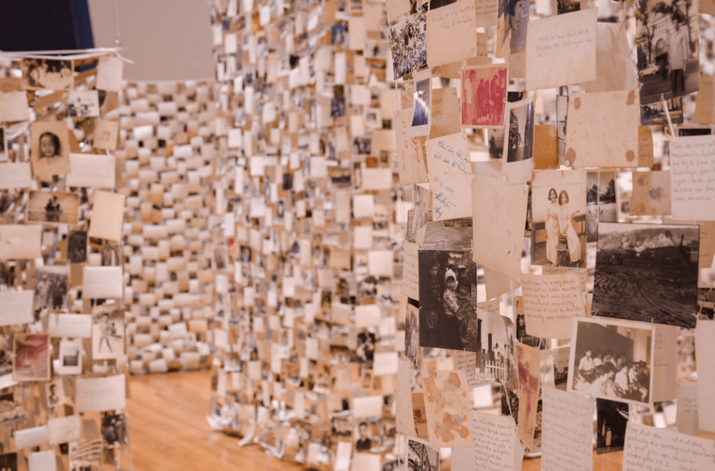 The work itself sees Lê incorporating photographs taken in Vietnam during the 1940s-1980s, curated from his own personal collection of abandoned photos he’s been amassing for years, with the majority dating to the pre-Vietnam War era before 1975. The images are those that might fill a family’s photo album: portraits, scenic vistas, birthdays, and holidays. For Lê, these are important records documenting the everyday lives of Southern Vietnamese people – how they dressed, looked, and felt. Such photos are one of the few records of South Vietnam that have escaped from the Northern Vietnamese communist government’s systematic effort to erase the pre-1975 existence of the South. The photographs, some facing out and others turned inward, have been stitched together to form fragile-looking, rectangular structures, like mosquito nets.