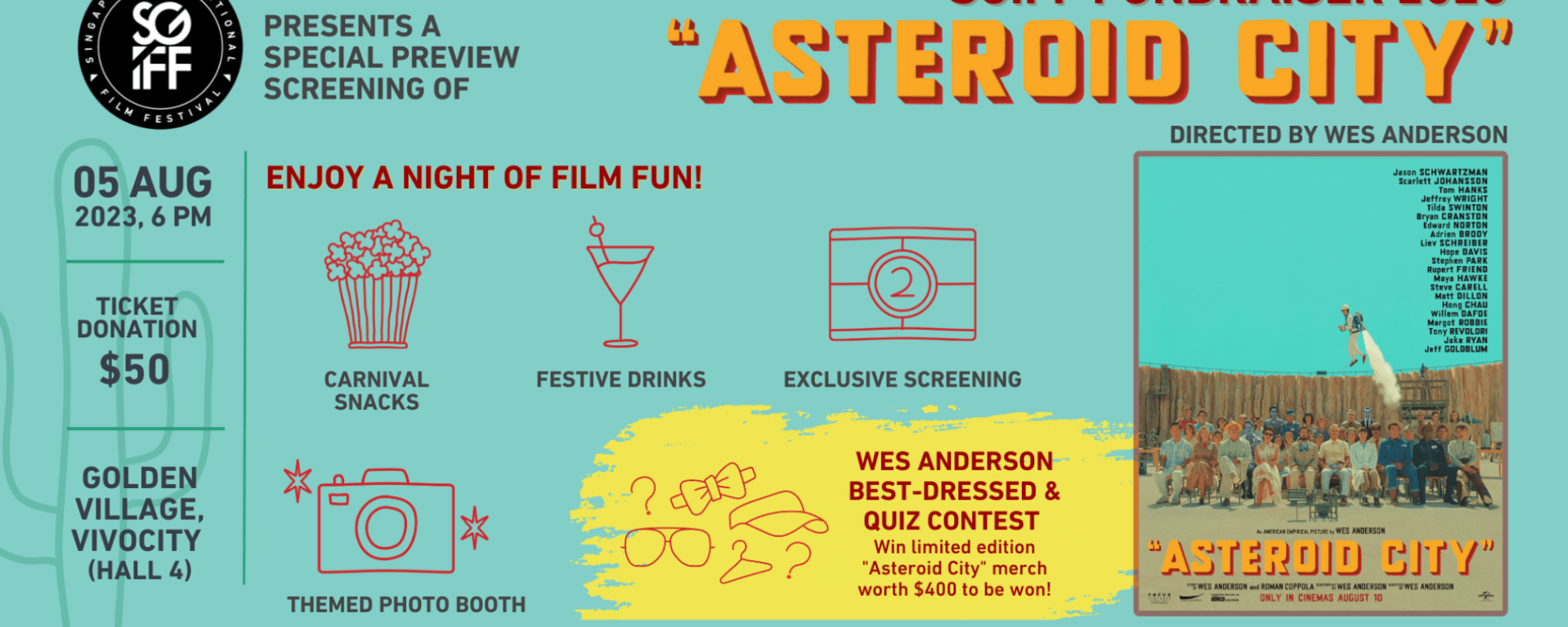 SGIFF’s Fundraiser 2023: Wes Anderson’s Asteroid City, plays on 5th August 2023 at 6 pm at Golden Village Hall 4 with a $50 donation. Secure your seat here
