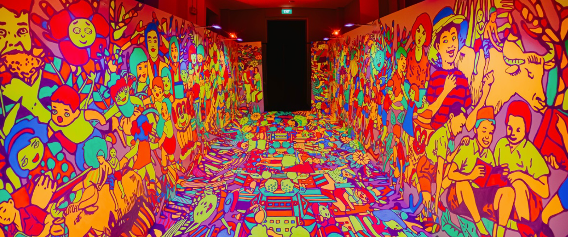 That idea extends now to “The Happiest Days of Our Lives”, which takes the form of a blacklight immersive mural inspired by the rich history of in the Bras Basah.Bugis precinct. Formerly home to many educational institutions like a Japanese Elementary School in 1920 to Waterloo Girls School in 1984, the centre’s history led Rizman to think of the creativity, curiosity, and playfulness that filled schools.