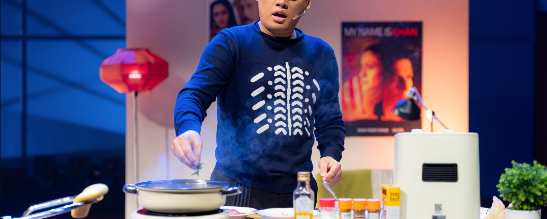 This is a multisensory show that aims to put audiences exactly in the mindset of Harith, and even before the show begins, he is in the kitchen, chopping onions and blending spices, before popping some samosas into an air fryer, with all these aromas filling the air and transporting us to a home environment. Hafidz as Harith is unabashed for his love of Bollywood, singing along to hit songs he plays out loud on his phone, and before we know it, he goes into performance mode, taking us on a rather unexpected journey down the history of his life as an eternal lover of the world’s biggest film industry.