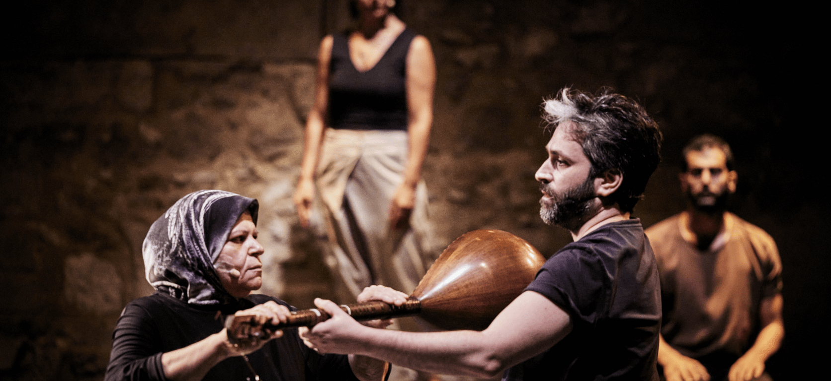 Toward the end, the performance takes on a surreal tone. The ensemble hums what is described as the oldest, haunting lullaby in Sumerian, an invocation that reaches across centuries. Is it a prayer? A plea for peace? Or simply a tether to something ancient and human, amid the chaos of the present? All this while Leila recounts a dream, the others gathered around her in a tableau that feels mythic, sacred. She becomes almost a seer, speaking truths that echo far beyond the stage. She lays a black cloth over Omran, who lays on her lap, as if sending the body away, knowing she can no longer hold on.