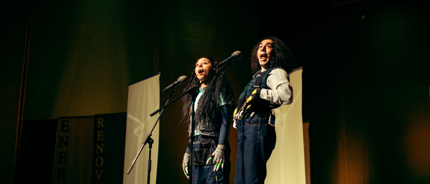 This is made even more confusing with the actors playing multiple characters throughout the performance, from a woman named Betty whose mother ends up working for the wind farm, or eventually, how both vampires seem to represent the corporation themselves delivering the report. The changes are not always obviously differentiated, at most putting on a pair of glasses to show a shift, and in terms of the content, much of it ends up repeated, to the extent it feels like Infante is belabouring and harping on the same simple idea of overwork, exploitation and suffering over and over without adding anything particularly new to it with each rendition.
