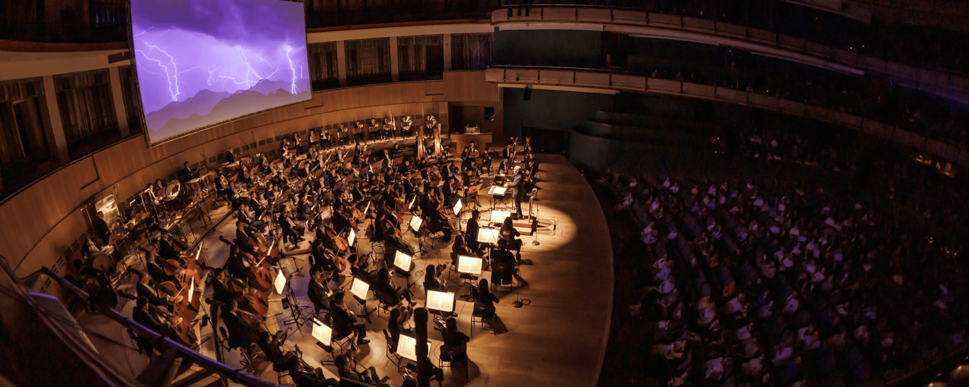 After intermission, the stage was reset for Strauss’ monumental An Alpine Symphony, rendered not just in sound but in stunning visuals by German musician-photographer Tobias Melle. Projected in high definition above the orchestra, Melle’s photographs, taken over multiple treks through the Bavarian Alps, were perfectly timed to match the music’s narrative arc, from the first light of dawn to the mountain’s peak and eventual descent into night.