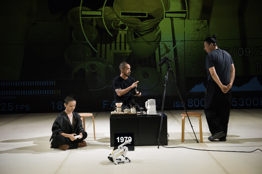 Their live performance blurs lines between staged and real. Seated at a small table with Choy filming beside them, they interact with a toy robot dog and an AI kettle as a 1888-second countdown begins. Projected close-ups of their faces accompany candid conversation, including a two-year silence with Choy due to personal conflicts, and their own romantic breakup after years as artistic partners. Their bond now persists in collaboration, even if no longer necessarily romantic.