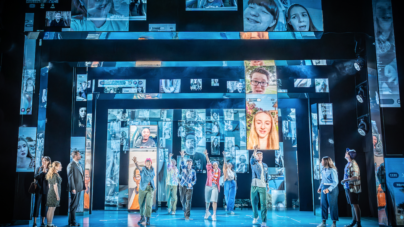 The projections are clean and purposeful, where social media feeds cascade across the stage, while the recurring motif of windows is also present – some projected, some translucent, they remind us how close and yet how far the characters are from one another. A curious, recurring image is that of dirty windows: smudged screens that seem to ask, with comic solemnity, whether too much waving has left fingerprints on our view of one another. It’s a small visual symbol, effective in mood-setting, and both haunting and intimate. Essentially, the set becomes a visual metaphor for Evan’s fragile psyche, where every connection risks distortion.
