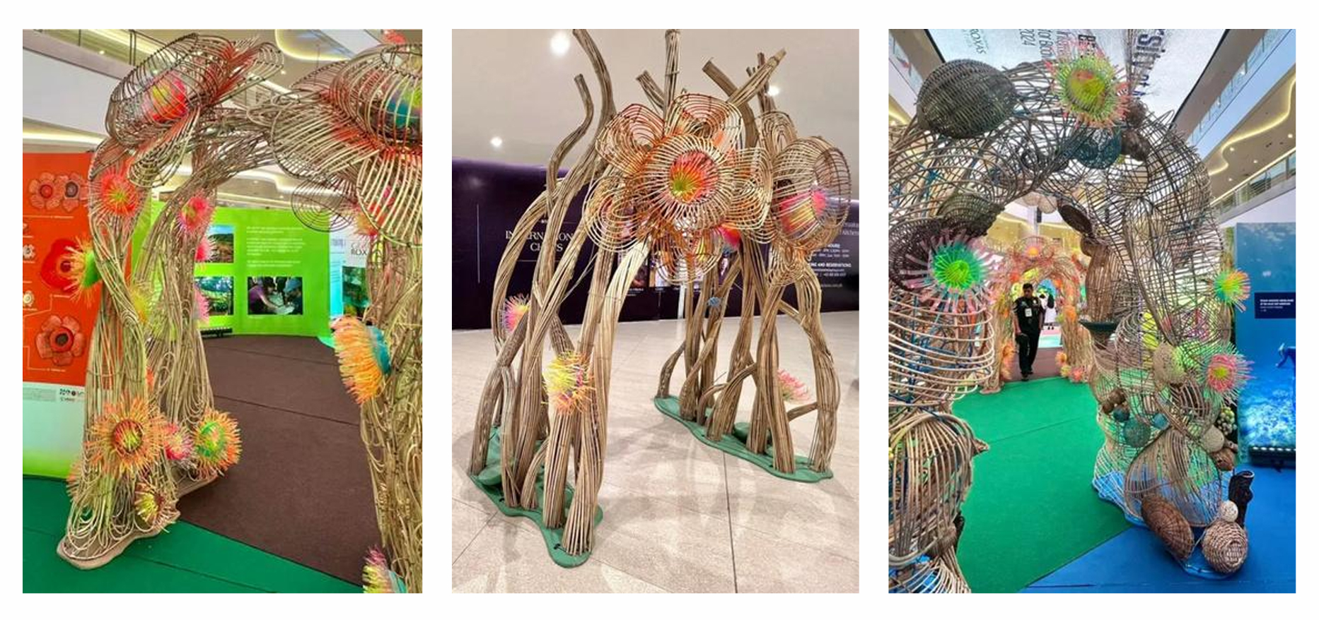 Closing the loop are Leeroy New’s installations, where recycled plastic, bamboo, and found objects are transformed into nest-like structures and floating boats. His works hover above viewers or sprawl organically through space, echoing bird nests, root systems, and island flotillas. They speak of environmental precarity, adaptability, and the ingenuity found in everyday survival. In New’s hands, trash becomes architecture, and leftovers become futures.