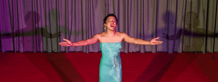 As much as it is clearly a show made on a budget, Pretty Ugly draws its strength from earnestness. Theo begins by emerging from the audience, smiling and waving at familiar faces, before standing centre stage in heels and a black velvet evening dress. Their hair is natural, makeup minimal. Theo is not performing a character or a drag persona; they are presenting themselves, polished, perhaps, but fundamentally authentic.