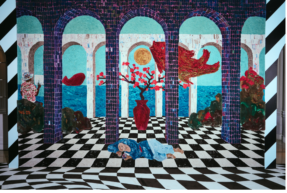 Perhaps the most unexpected transformation unfolds at The Verandah Café, where Dr. William Lim redefines the idea of a dining space. His installation, Walking On A Bright Future, turns the café into a surreal landscape inspired by his painting A Bright Future. Think hand-tufted tapestries, checkerboard carpets, and dreamlike motifs—a world where fish soar through the sky and imagination takes centre stage.