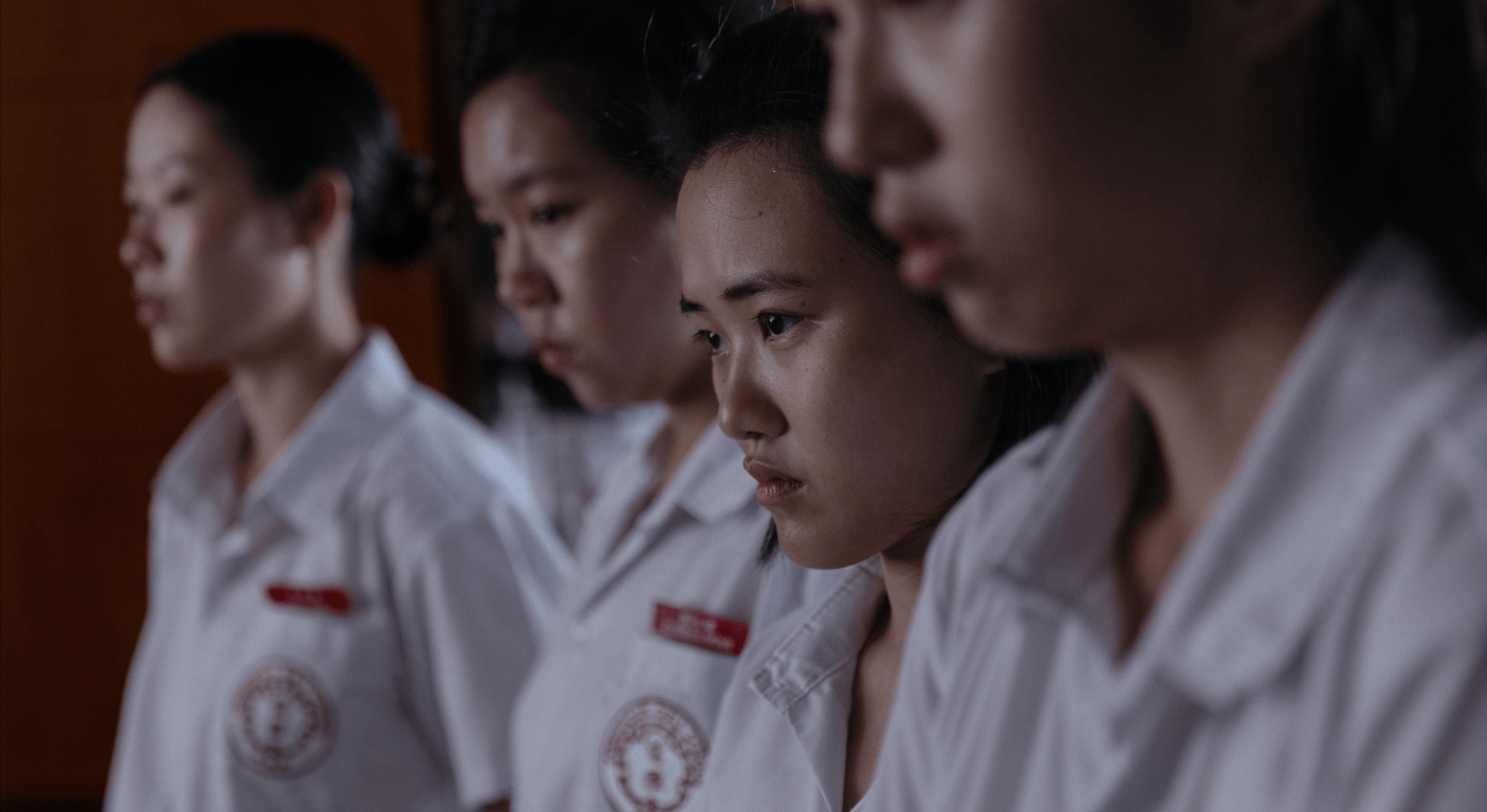 Tan leans further into this through the school’s rules, many of which border on the surreal in their rigidity; watch faces measured against a 50-cent coin, hemlines checked with rulers, bra colours inspected under white uniforms. Students interrupt conversations mid-sentence to greet passing teachers before resuming as if nothing happened, while Confucian analects line classroom boards as moral instruction. These details accumulate into something both hyper-specific and universally felt, illustrating how control becomes normalised, how structure quietly shapes behaviour, how the pristine uniform itself becomes a symbol of restraint. And against this, the girls push back, not necessarily through grand acts of rebellion, but through small, messy, deeply human moments of defiance.