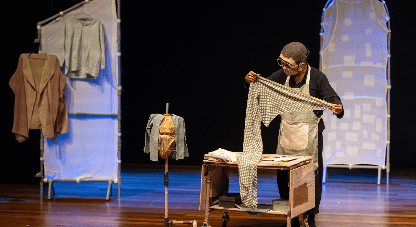 Conceived and produced by Papermoon Puppet Theatre, this latest iteration of director and playwright Maria Tri Sulistyani’s long-evolving work arrives not just as a performance, but as something closer to a ritual, a shared space in which audiences are invited to confront the fragile, inescapable truths of love, memory and loss. Following its mysterious opening scene, what follows is relatively lighthearted. We meet Puno, a tailor, hunched over his sewing machine, going about his daily routine. In this opening segment, he is embodied by a masked puppeteer, largely silent, communicating through gesture and occasional bursts of unintelligible sound. There is humour here, even playfulness, as he interacts with customers and the audience, drawing easy laughter.