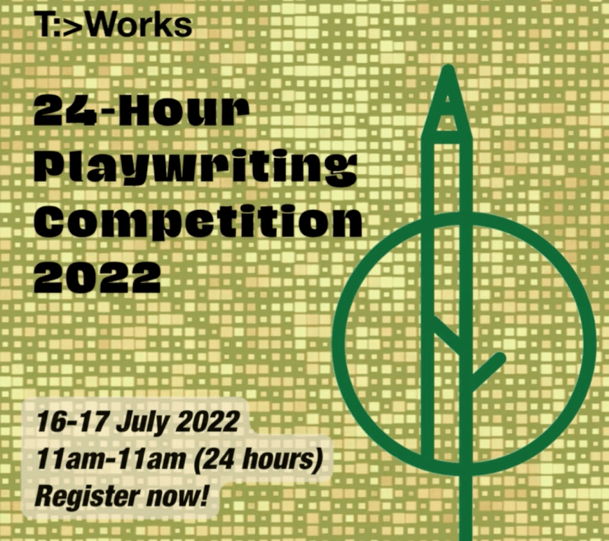 Now into its 25th year, the much-loved playwriting competition in Singapore, the 24-Hour Playwriting Competition returns on 16-17 July. For the first time, T:>Works invites past participant and transdisciplinary poet and performance maker, Ang Kia Yee, to conceptualise this year’s competition. They responded to the call by proposing the first ever hybrid competition with a focus on ecocentric considerations, exploring liveability and sustainability. The T:>Works … Continue reading Registration now open for T:>works’ 24-Hour Playwriting Competition 2022